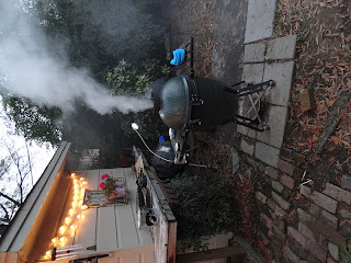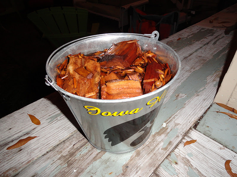 The temperature of the grill seem pretty good at 400 degrees, knowing it would cool down once I added the wood and the turkey. I used chunks of apple wood, which were soaked overnight. I like apple wood, because it is not overpowering like hickory or mesquite.