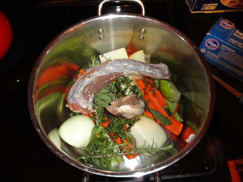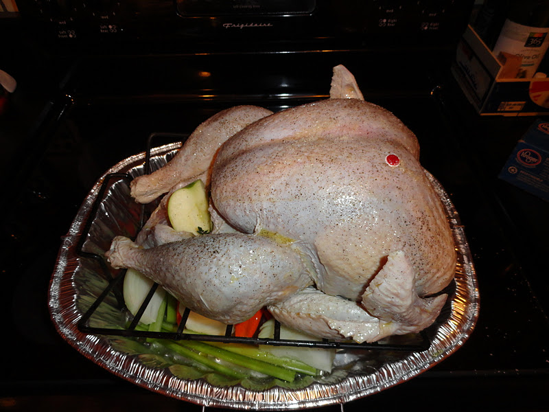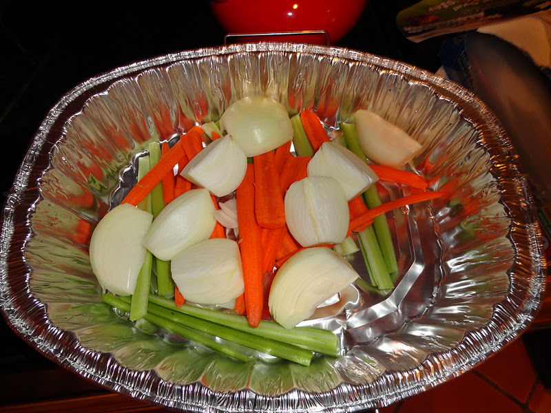 First, I cut some carrots, celery, and onions in half and put them in the bottom of the doubled aluminum roasting pan. I then put a v-rack on over the vegetables in the pan. I rubbed the inside of the turkey, which was just over 15 pounds, with salt and pepper and stuffed it with apples and fresh sage and thyme. I rubbed the outside of the turkey with some olive oil and salt and pepper. It was now ready to go on.