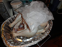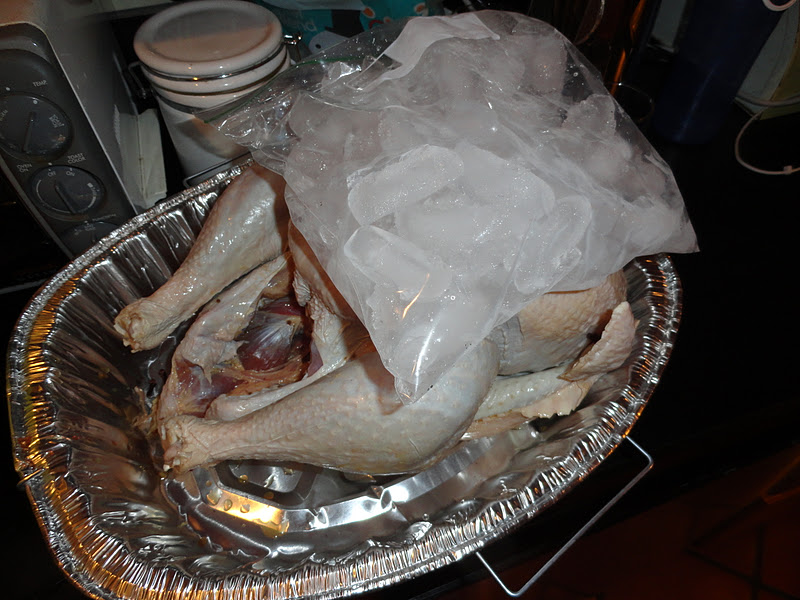 Naked Whiz, this will lower the temperature of the breasts and allow them to cook more evenly with the thighs. I kept the ice on, while I prepared the rest of the ingredients for the turkey.