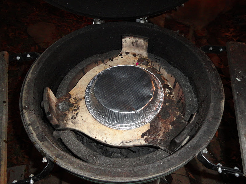 I used the Green Egg's place setter, which allowed me to cook the turkey with indirect heat. on the place setter I put a couple foil pie pans. Then I put the turkey pan on top of those. This gave me a little space between the place setter and the pans. In the past, I had trouble with everthing in the roasting pan getting charred.