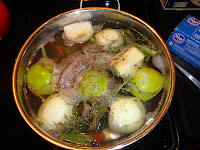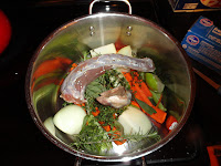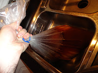 So how does this effect the turkey, it means I have to get up at 4:30am to start cooking. The night before cooking, I brined the turkey, which helps keep the turkey moist through the cooking process. Brining technically is soaking meat in salt water. However, I made my brine with 1/2 a gallon of apple cider, salt, cinnamon sticks, cloves, anise, brown sugar, and soy sauce. The recipe was slightly adjusted from a recent issue of Bon Appetit. I basically brought all those ingredients to a boil and then let them cool. I then added enough water to completely submerge the turkey in a brining bag (about 1.5 gallons). I let them sit in a cooler over night.