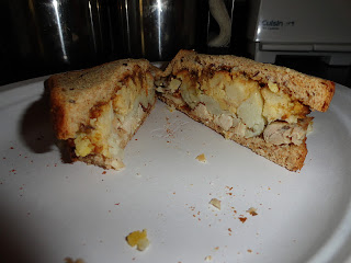 Oh and the best part . . . the part that I dream about all night long. The leftovers sammy. First, I toasted some whole wheat bread. Second, I layer on the turkey, dressing, mashed toes, gravy, and cranberry sauce. I have the press the sandwich together, so it sticks. Then I wrap it in foil and stick in the toaster oven to warm up. I almost came to tears while eating it.