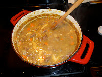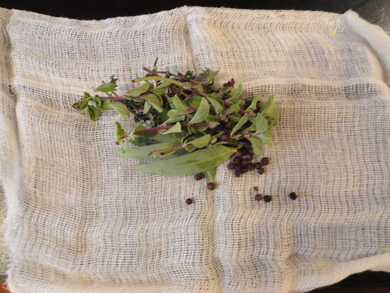 I added the beef and poured in a couple Spaten's and enough beef stock to generously cover all the veggies and the beef. I then made a sachet by wrapping a couple sprigs of thyme, oregano, bay leaves, and about 10 peppercorns in cheesecloth and tying it together. I added this to the stew. I simmered the stew on low heat for about an hour and 15 minutes.