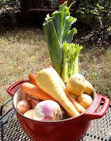 I chopped the veggies and separated them into two groups: 1) onions, leeks, shallots, garlic, celery and 2) carrots, turnips, parsnips, potatoes. I heated up some olive oil and a bit of butter in my heavy cast-iron pot and then sautéed the first group until the onions were translucent (5-10 minutes). Then I added the second group and simmered them for about 15 minutes.