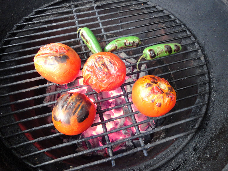 Then I got the Big Green Egg started to grill the meat and vegetables. First, I grilled some tomatoes and Jalapeños until the skins were blackened. I peeled off the skins of both. I diced the Jalapeños and chopped the tomatoes.