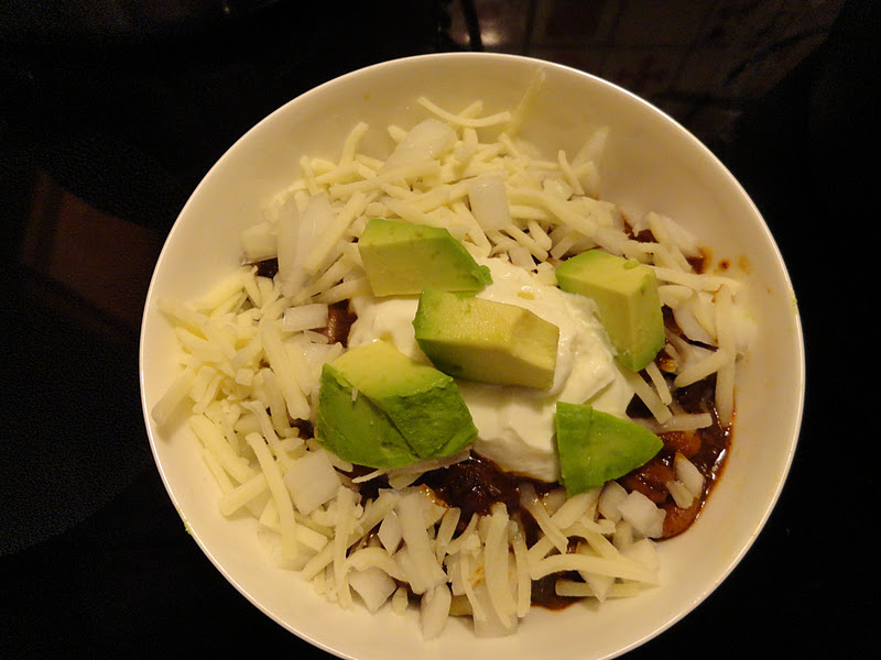 When it was done, it was thick and meaty. I served it over macaroni noodles topped with diced onions, shredded Monteray Jack, light sour cream, and a bit of advocado. The pasta addition is a Midwest thing. My southern wife thinks it is communist, and won’t use it. To each their own.