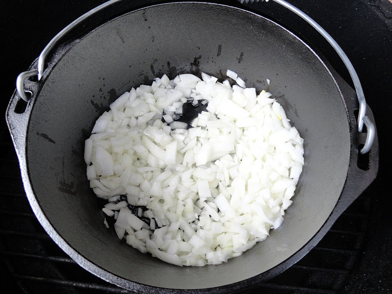 Finally I was ready to started making the chili, I first sautéed some diced onions in the cast iron pot on the grill. After 5-10 minutes, I added some minced garlic and sautéed further for a couple minutes.