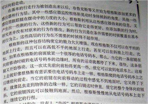 以在斜坡上行走。比如,如果在Genghis的前面放置一个很厚的电话号码本,那么,当它的一条前腿在向前移动时碰到电话号码本的边缘时,所有的运动就都