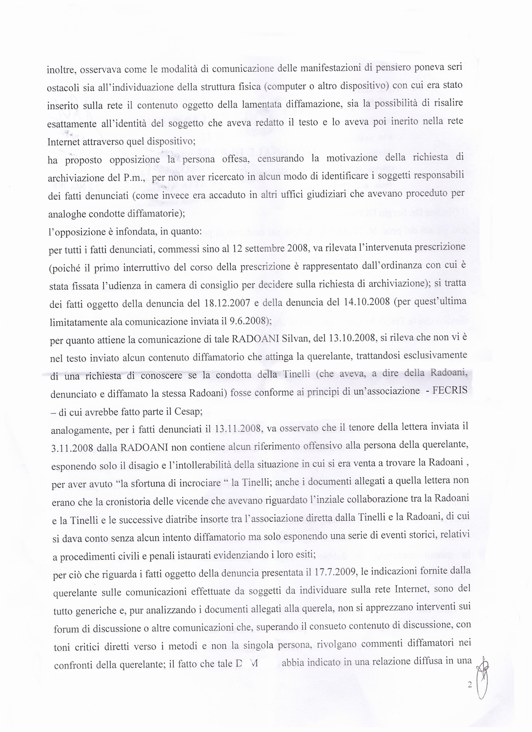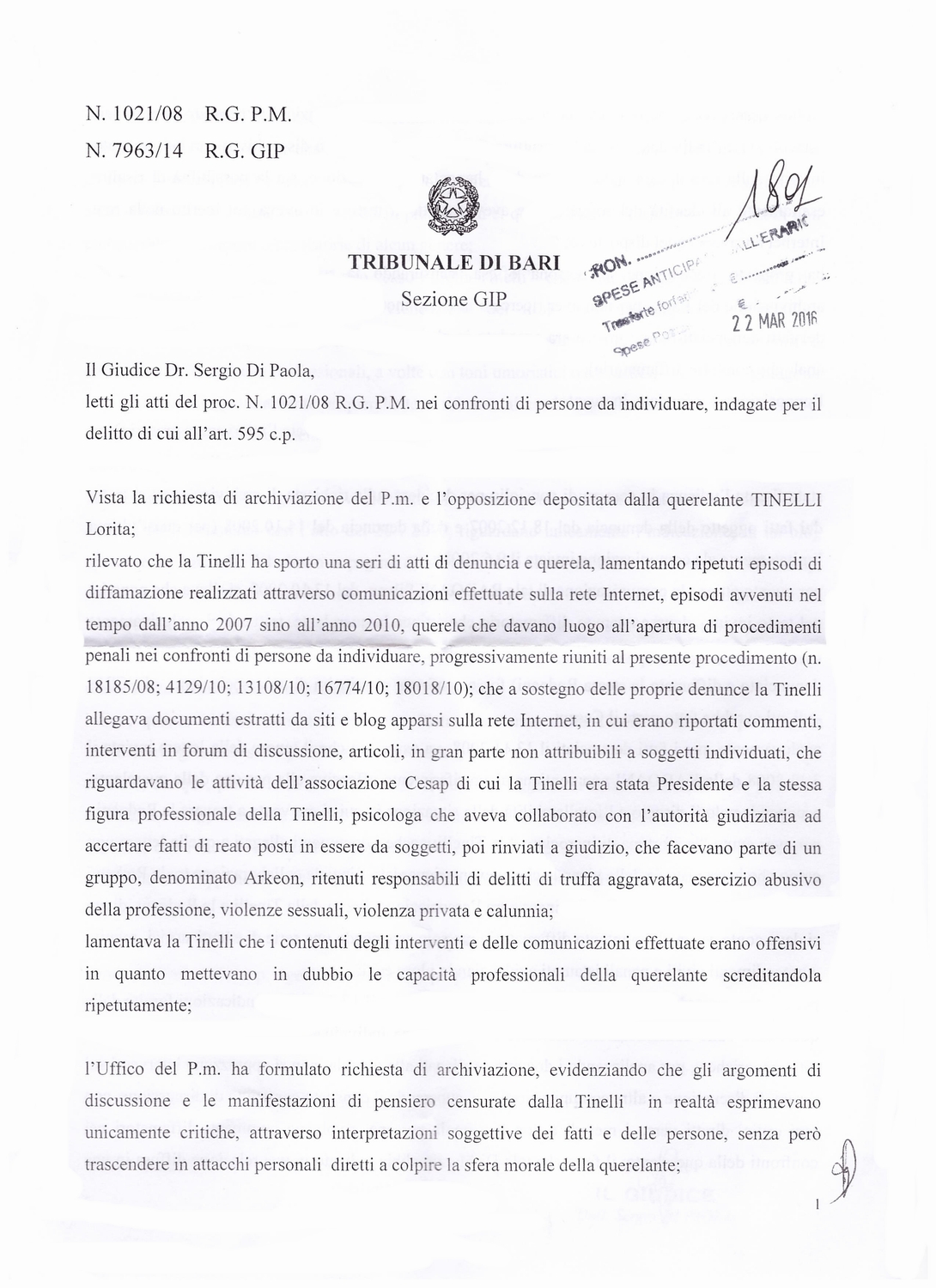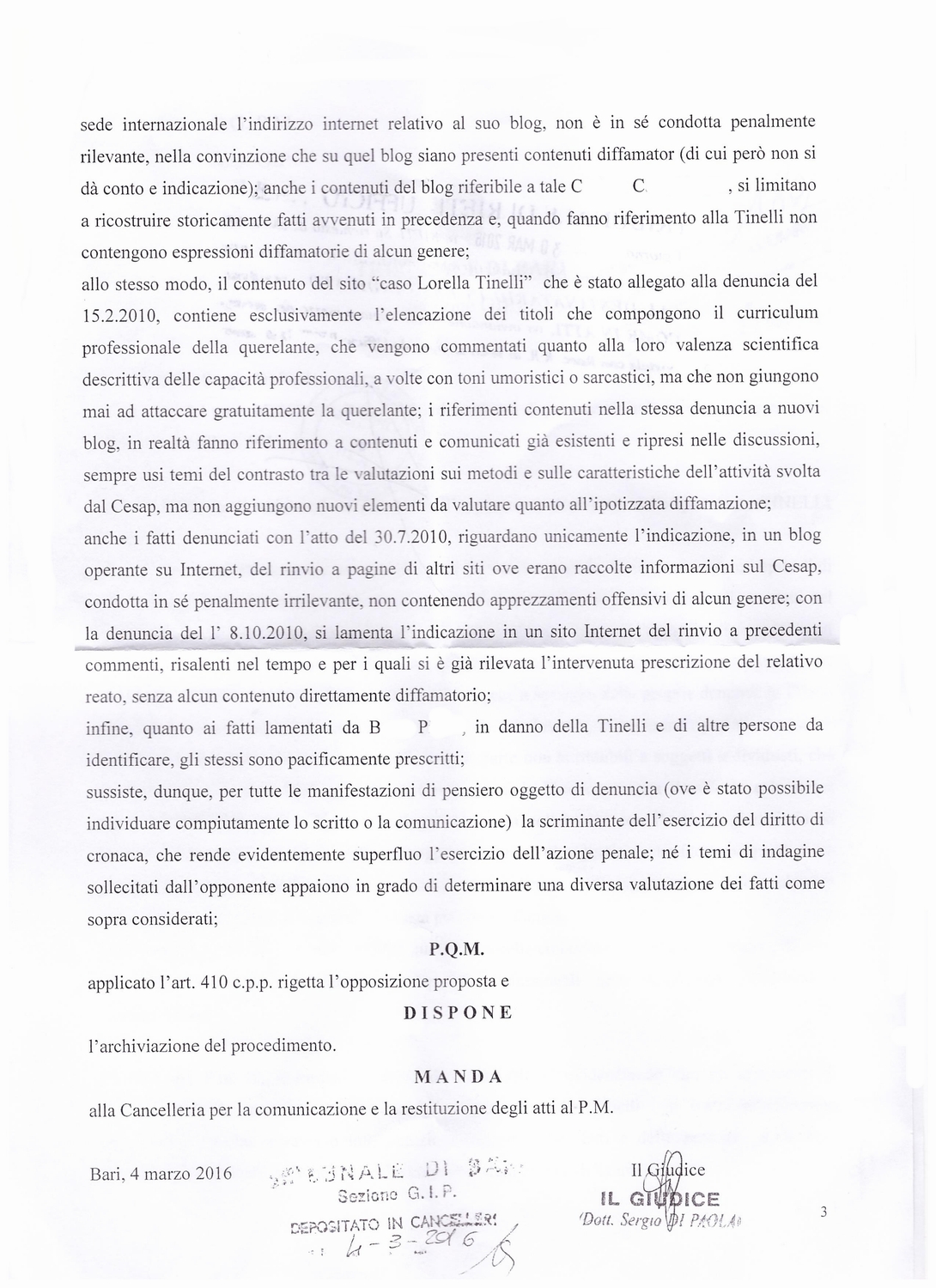 Lorita Tinelli Il mio avvocato con gli avvocati delle controparti, sentite le esigenze mie e del presidente del CeSAP, Luigi Corvaglia, hanno concordato una chiusura tombale, ovvero che come noi facevamo un passo indietro l'avrebbero dovuto fare tutte le altre parti. Ciò significava ritirare le querele reciproche e nel caso degli altri smetterla di continuare a rompere le palle con blog anonimi e cose del genere. Una chiusura tombale significa che ognuno dimentica l'altro. Ma questa cosa non è avvenuta, motivo per cui io ora mi sento autorizzata a pubblicare quel che voglio, ovviamente sempre con la mia faccia e non in blog anonimi, come è solita modalità delle persone in questione ormai da anni