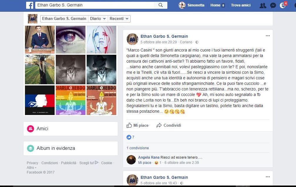 5 ottobre ore 20,29: <<"Marco Casini " son giunti ancora al mio cuore i tuoi lamenti struggenti (tali e quali a quelli della Simonetta carpigiana), ma vale la pena ammalarsi per la censura dei cattivoni anti-sette? Ti abbiamo fatto un favore, fidati, ...siamo anche cannibali noi, volevi pasteggiassimo con te? E poi, nonostante me e la Tinelli, c'è vita là fuori......Se riesci a vincere la simbiosi con la Simo, acquisti anche una tua identità e autonomia di pensiero e magari scrivi cose più originali invece delle solite sfrangiaminchiate. Ce la puoi fare cucciolo ...e non piangere più. T'abbraccio con tenerezza rettiliana...ma no, scherzo, per te e per la Simo solo un mare di coccole 💖 Ah, mi sono auto segnalato a fb dato che Lorita non lo fa...Eh beh noi branco di lupi ci proteggiamo. Segnalatemi tu e la Simo, basta digitare un tastino, potete farlo anche dalla stessa postazione... 😉😘😘>>