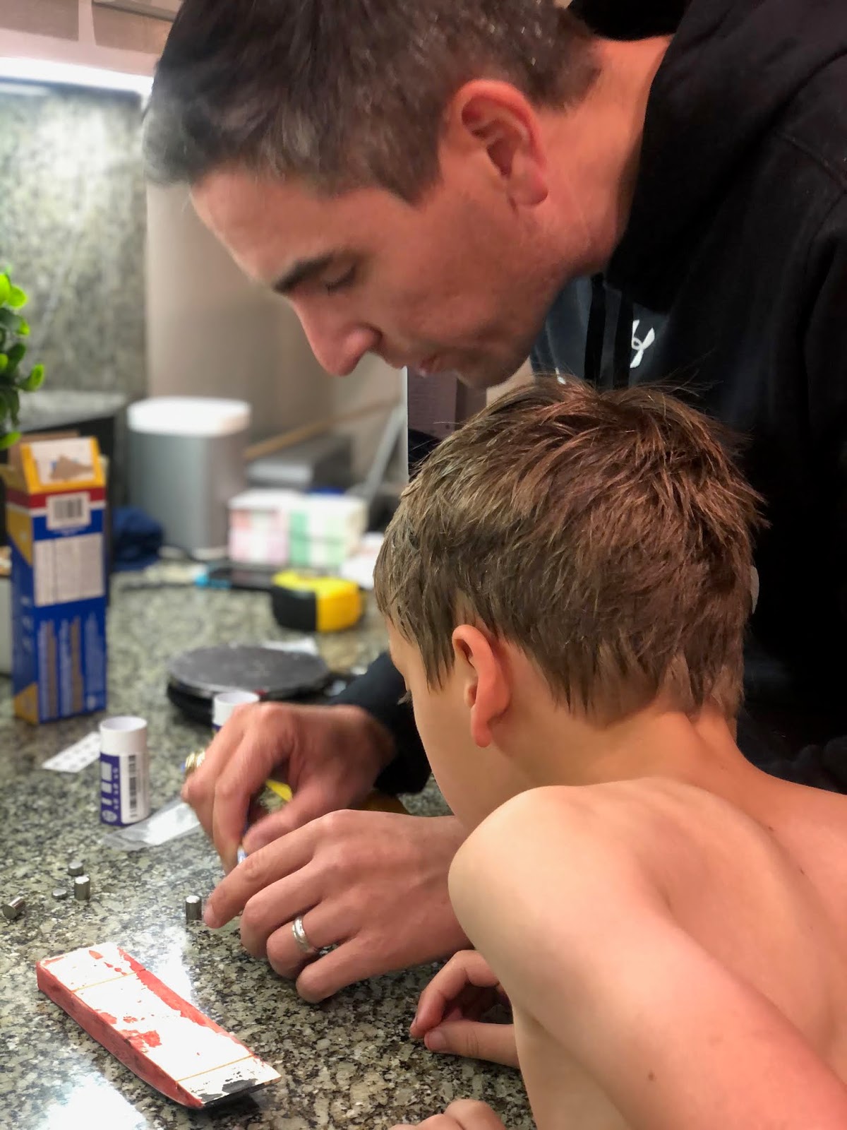 Working on their boy scout Pinewood Derby Cars....