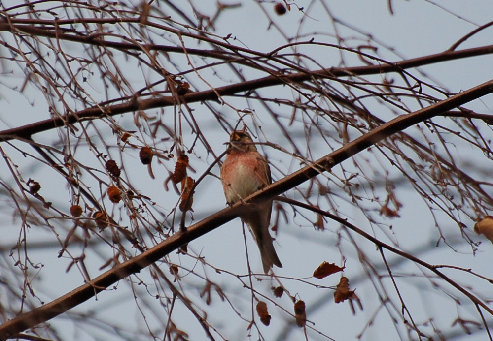 We have a little patch of mixed woodland planted about 15 years ago behind the pottery, it has been left fairly dense, with some paths cut through it and is a great place to go for a moment of peace and quiet. This is where I saw most of the smaller birds, including my very first linnet, looking exotic with his pretty pink chest.