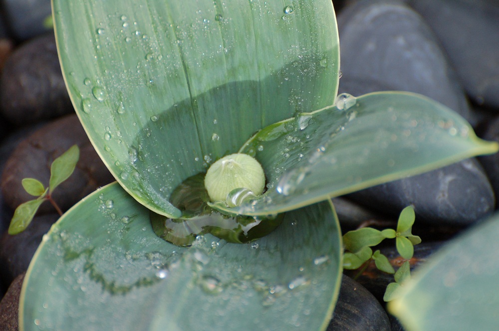 Allium karataviense 'Ivory Queen', with smooth, sculptural leaves and buds, followed by white tennis-ball flowers. I am hoping that their clean lines will complement the jar.
