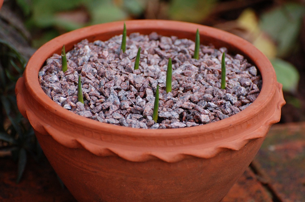 Muscari 'Pink Surprise' (a present from René) in it; the grit dressing keeps it looking neat, stops the compost from getting compacted by the rain, keeps the drainage sharp around the emerging shoots, wards off slugs, mice and squirrels, and generally fosters a sense of satisfaction in the gardener. I never seem to have enough grit and gravel. I hope Father Christmas isn't listening - I draw the line at getting grit in my Christmas stocking.