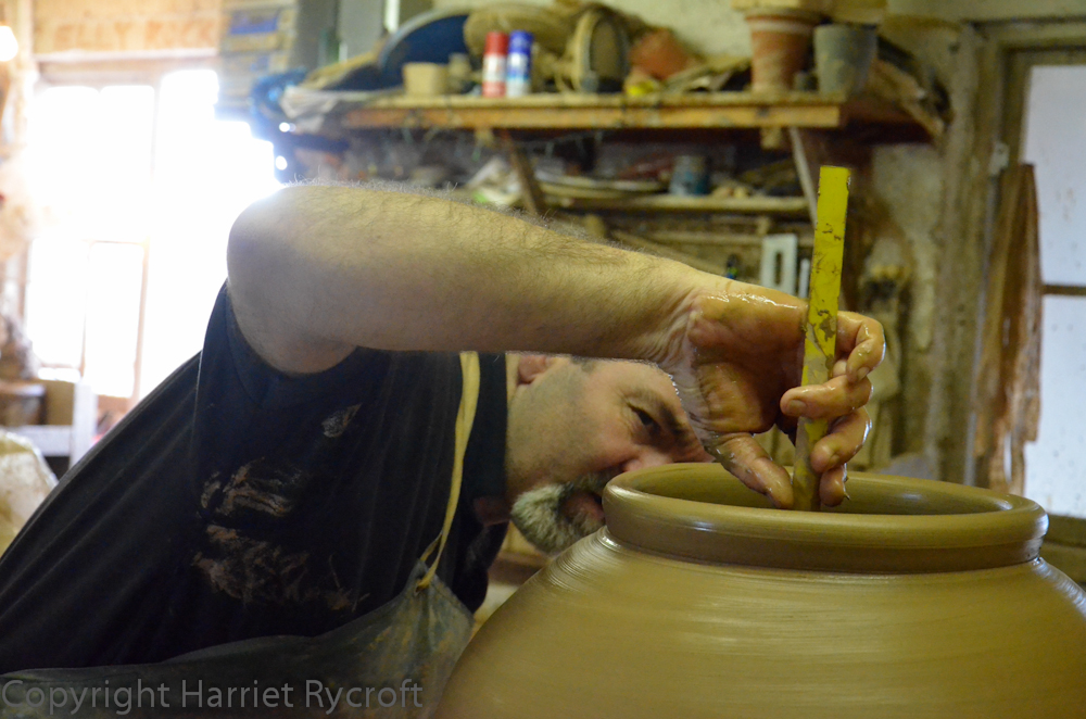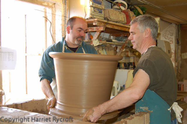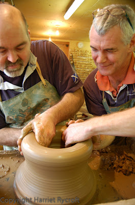 I have only ever had one go at throwing a pot (and produced one small, wobbly pot with a lot of help) but this was enough to show me how physically hard this must be to do all day. The clay is heavy, cold and wet. It looks smooth but it contains grog (see my post about the clay) so as it spins it feels like wet sandpaper, you have to apply a deceptive amount of force to shape it, which is hard on the fingers, wrists, elbows, shoulders, back... And a moment's inattention can have the whole thing collapse back into a blob.