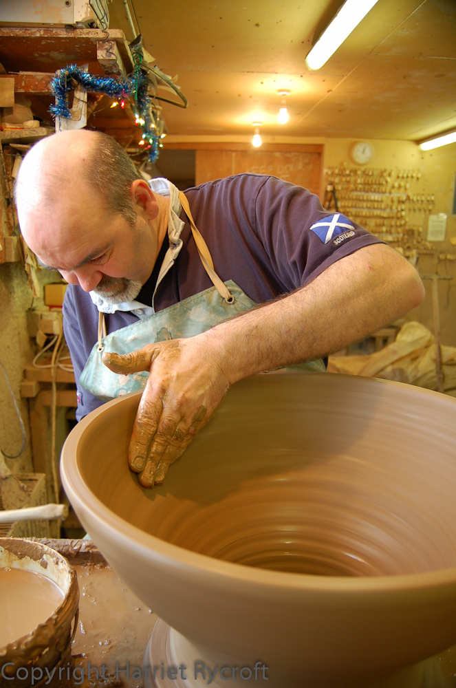 If you climb the stairs to the main throwing room the first person you are likely to meet is Andy Gill. This is apt because he has worked at the pottery for 30 years, almost since its foundation. I find it hard to imagine him as a teenage apprentice now but he must have been one once.