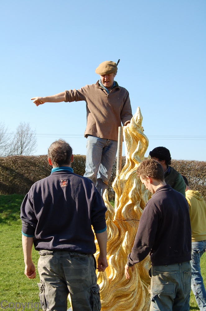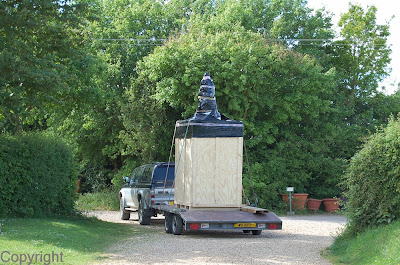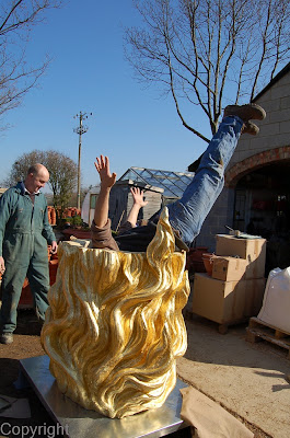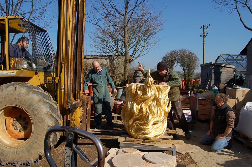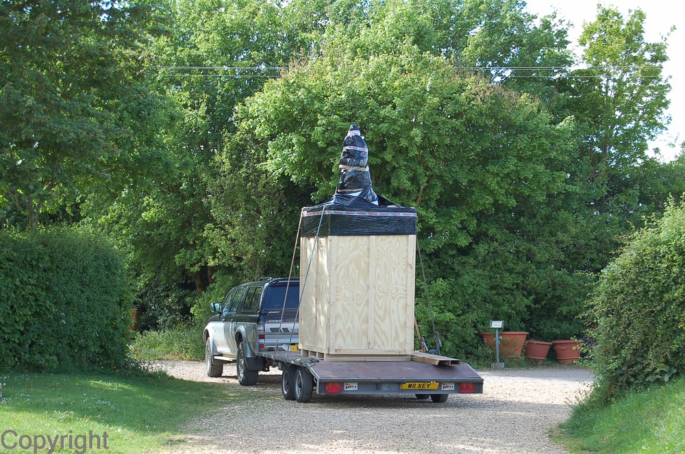 All hands were then required to move the heavy pieces outside on a trolley and through the courtyard garden to the packing area. Placing the bottom segment on the sculpture's metal base was only possible with Dave's fork-lift skills and John and Brian's combination of teamwork, lateral thinking and brute strength.