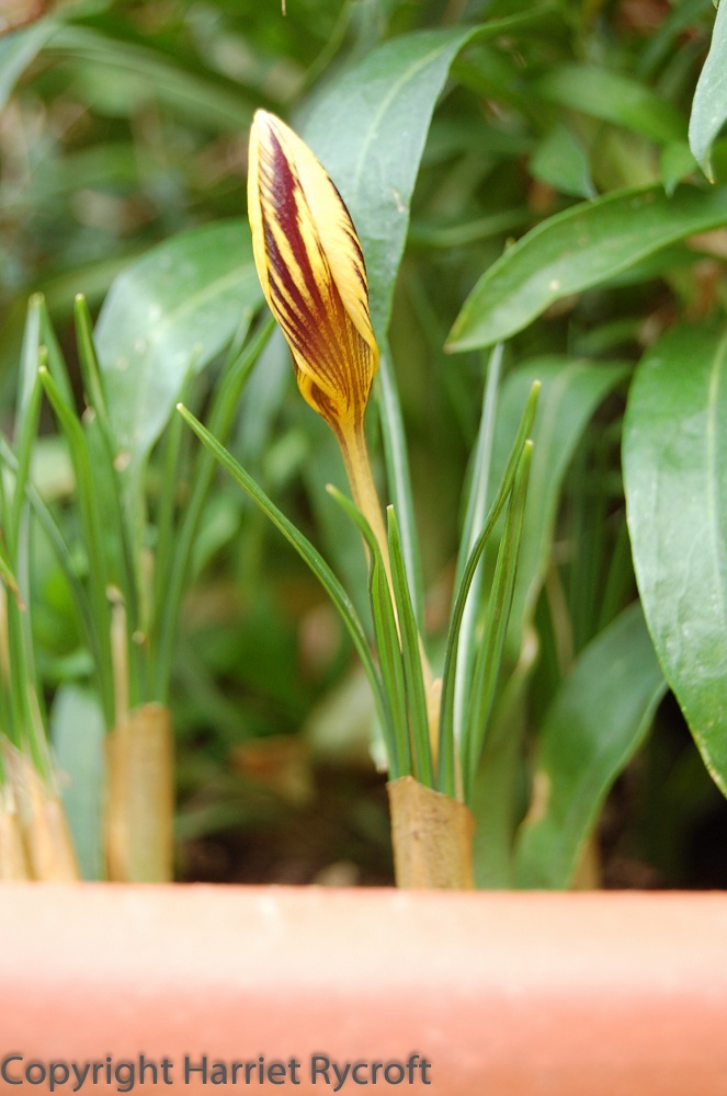 Last week saw our first iris open, and this year's earliest crocus flower is 'Gypsy Girl', just beginning to open this week. She is a gorgeous, golden yellow with strong, clear, rich reddish-brown stripes on the outside of her petals.