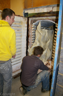 We are used to odd behaviour at the pottery, but when he started work on a version 3.15 metres tall some of us thought he really had cracked this time. Bear in mind that the picture on the left was taken UPSTAIRS in the pottery. The kilns are downstairs.