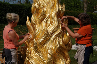 After emerging from the kiln the pieces were all then sprayed with a yellow ground by Chris and hand-gilded with 23.5 carat extra-thick gold leaf by Hilary and Lynda. You can imagine what an enormous surface area an object like this has!