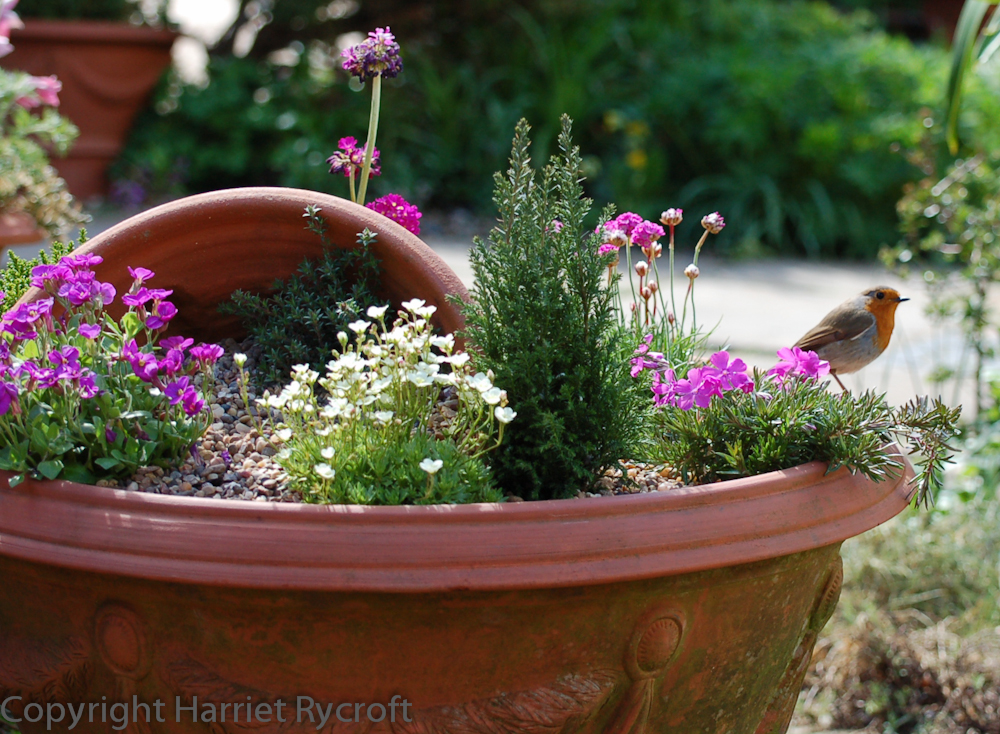 Today I ate my lunch as usual on the bench in the courtyard garden, I kept my camera with me because two robins and two dunnocks had been skittering about. The dunnocks disappeared (they don't like publicity) but the two robins shared my bread and one of them kindly posed on a pot which I had planted with alpines at the end of March when I went to talk to the friendly people at Kennington Horticultural Society near Oxford.