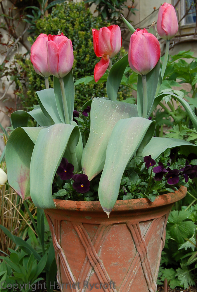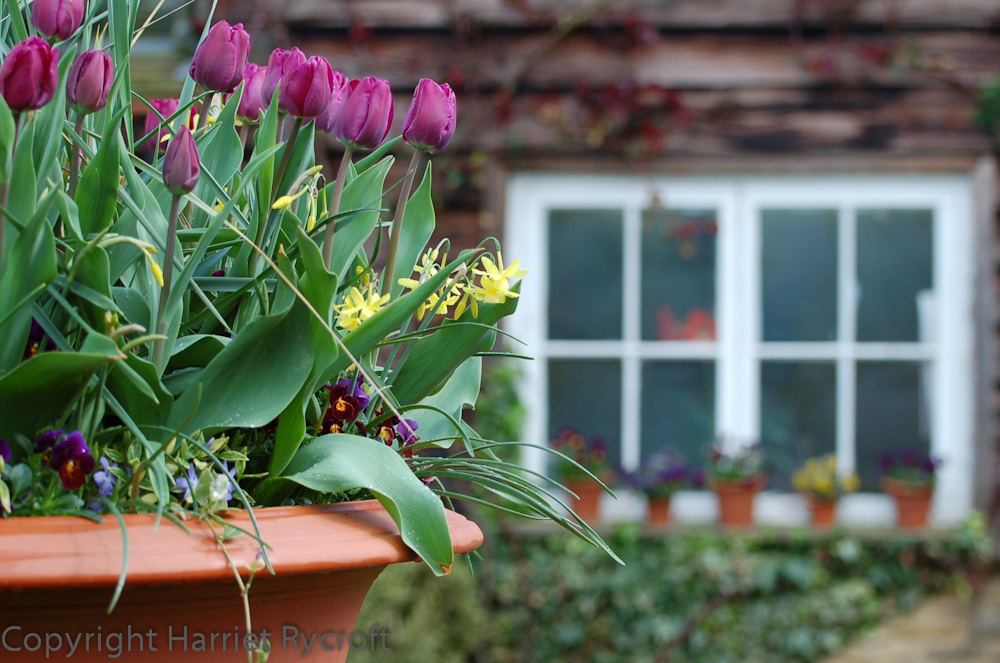 In the courtyard garden one of the most reliable tulips, 'Negrita', is oozing purpleness from its perch on top of the well. No matter which tulip I plant in this pot I always enjoy watching the wave of colour run from the south-western side of this huge pot round to the shadier northern side until it can be seen from every angle.