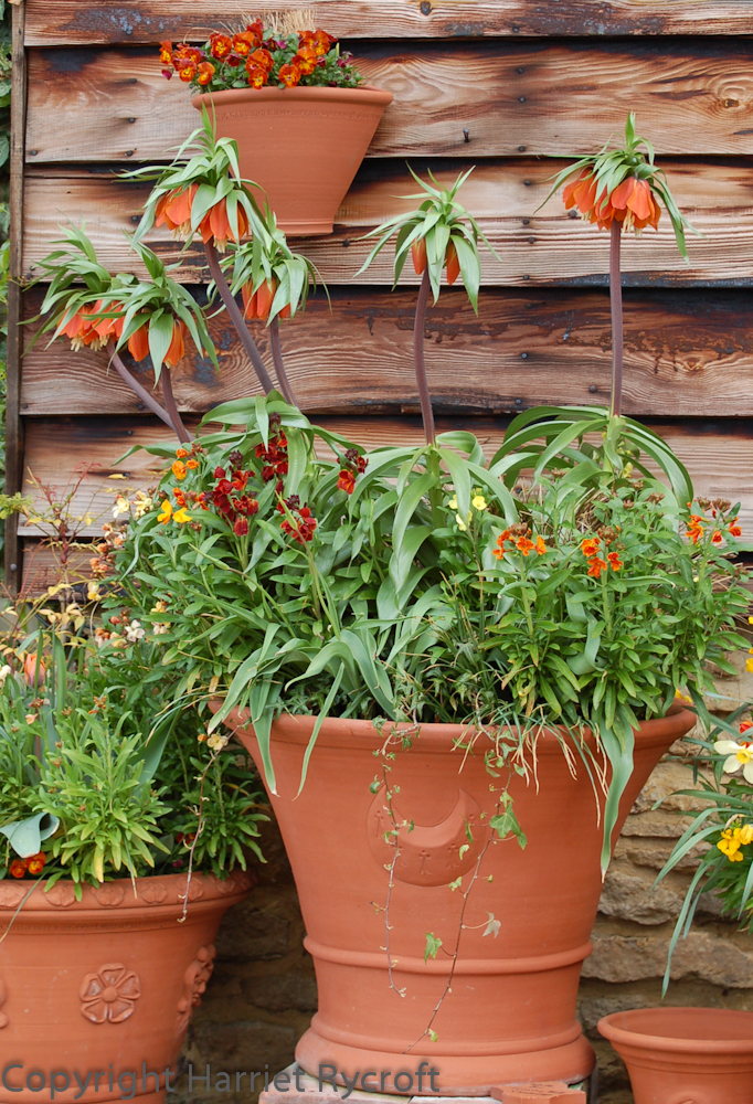 Fritillaria imperialis 'Rubra Maxima' in a large Lemon Pot made and decorated for Trinity Hall, Cambridge, on display by the doors into the main pottery building.