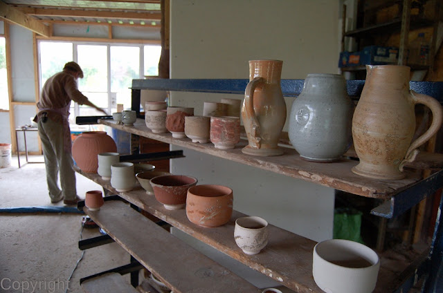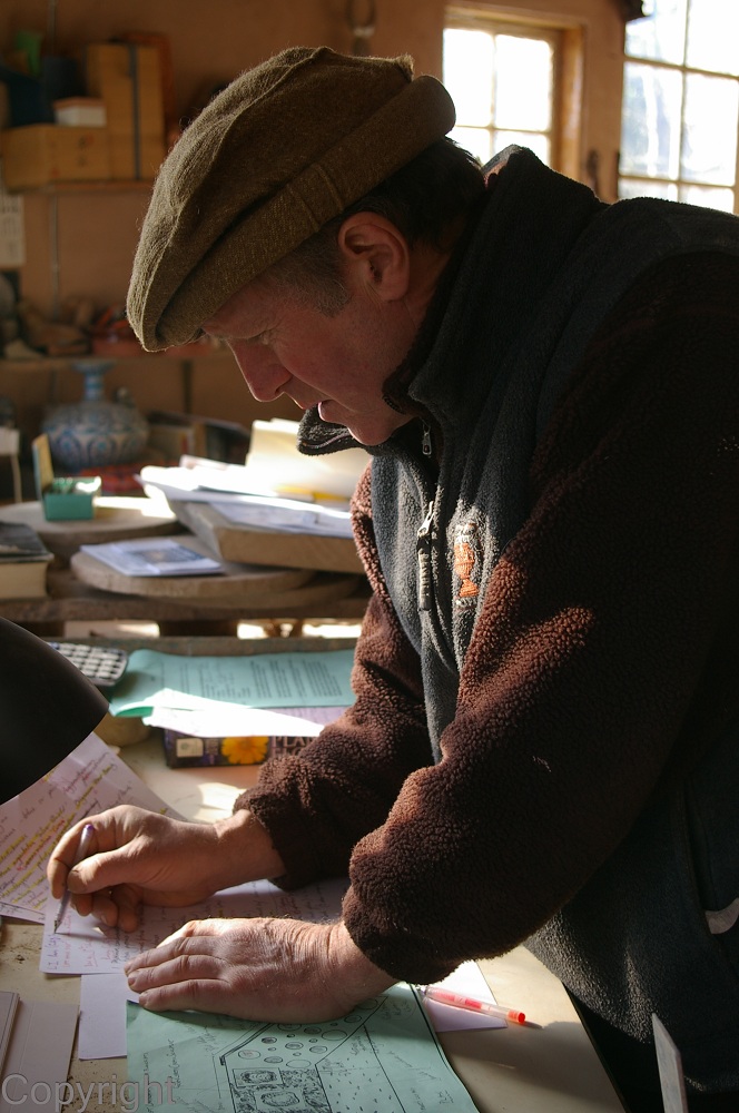 If you are looking for him at this time of year just follow the sound of choral music to his studio, which is tucked behind the kilns. This room, littered with sketches, postcards, shards of Roman pottery, Japanese sake cups and home-made tools all covered with a fine layer of clay dust, is where he's working on the latest range of pot designs. Here's a little