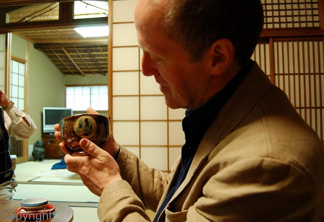 | Admiring a collection of tea bowls in a private house in Kyoto |