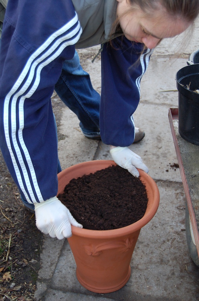 We then top up the compost to about an inch below the rim of the pot, give it several good hard taps on the ground (don't put your hands in and squash the compost down, you'll ruin its structure and impede drainage and aeration), and water in. An inch of grit as a mulch will help to stop the surface of the compost from forming a water-resistant cap and will make the pot look neat.