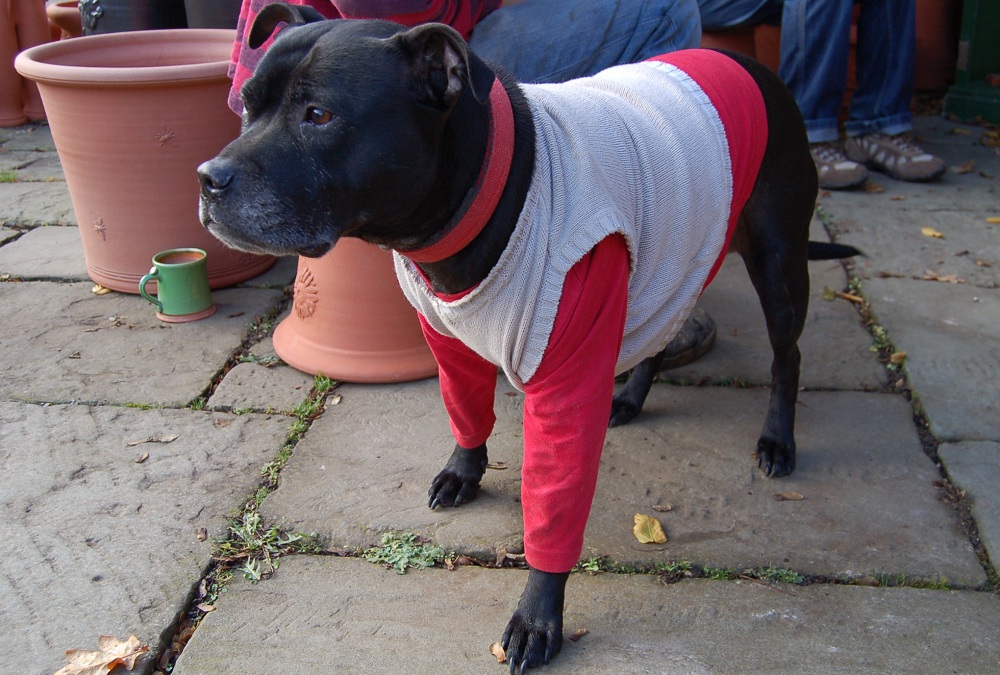 The weather has at last started to feel wintry. This makes me and Hooley miserable. Hooley is Joe's dog, a labrador/staffy cross, she has a melancholic disposition and she feels the cold. Luckily Joe has an assortment of small children as well as a dog, so this week Hooley arrived looking much happier in a shirt and jumper. She didn't mind us laughing at her.