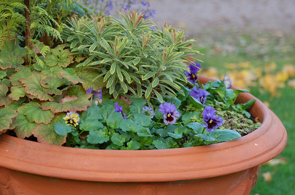 | Tellima grandiflora, Euphorbia 'Ascot Rainbow' and Pansy 'Frizzle Sizzle Twizzle' looking tasty |