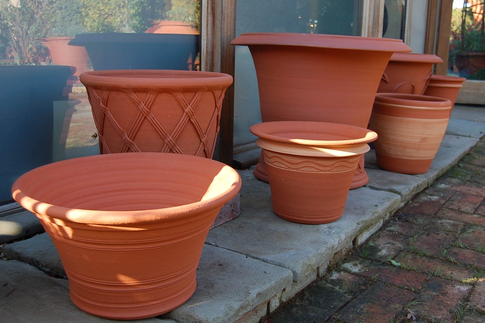 The pots with contrasting decoration are a new range designed by Jim's eldest son Adam, a pale slip is applied freehand before firing. This technique is a good way to tone down the orangeness (not always popular) of the new terracotta without having to wait for weathering to occur. I like the contemporary look of these; I think they will probably invite more simple plantings than my usual overflowing style.