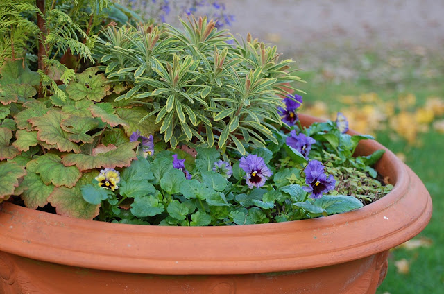 I have been planting like mad and the mild weather has allowed plantings done in the last two or three weeks to knit together more quickly than usual. I cram a lot of plants into winter plantings but it is necessary to leave some space for plants to develop and bulbs to flower, so in a cold autumn/winter the pots can look a bit sparse until early spring.