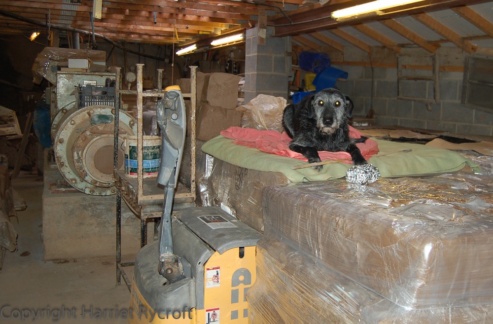 | Richard's beloved dog Willow comfy on a pallet of maturing clay |