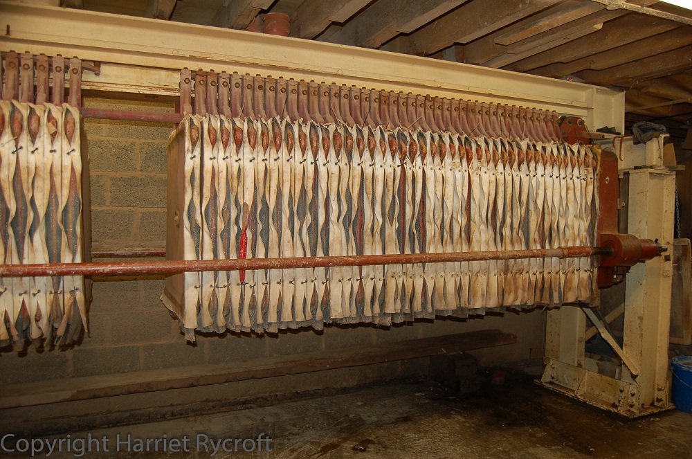 Once enough slip has been sieved the liquid is then pumped into the filter press, which takes a few hours to squeeze out excess water. For flowerpot throwing a moisture content of about 25% is required, so a sample is taken from the vat and weighed so that the amount of water to be removed can be calculated. A float switch stops the press when enough water has poured out into a tank.