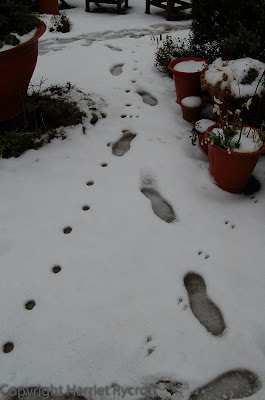 A thin layer of snow can be useful for reviewing the layout of a garden as lines of desire created by various users are clearly visible. In this case (see left) Puss-Puss and the blackbirds obviously have different priorities. Musing on this was not enough to keep me occupied, however, so I went to pay a visit to Richard and Brian in the clay room.