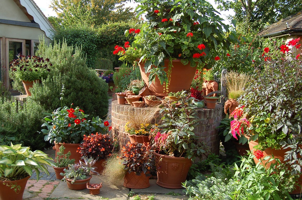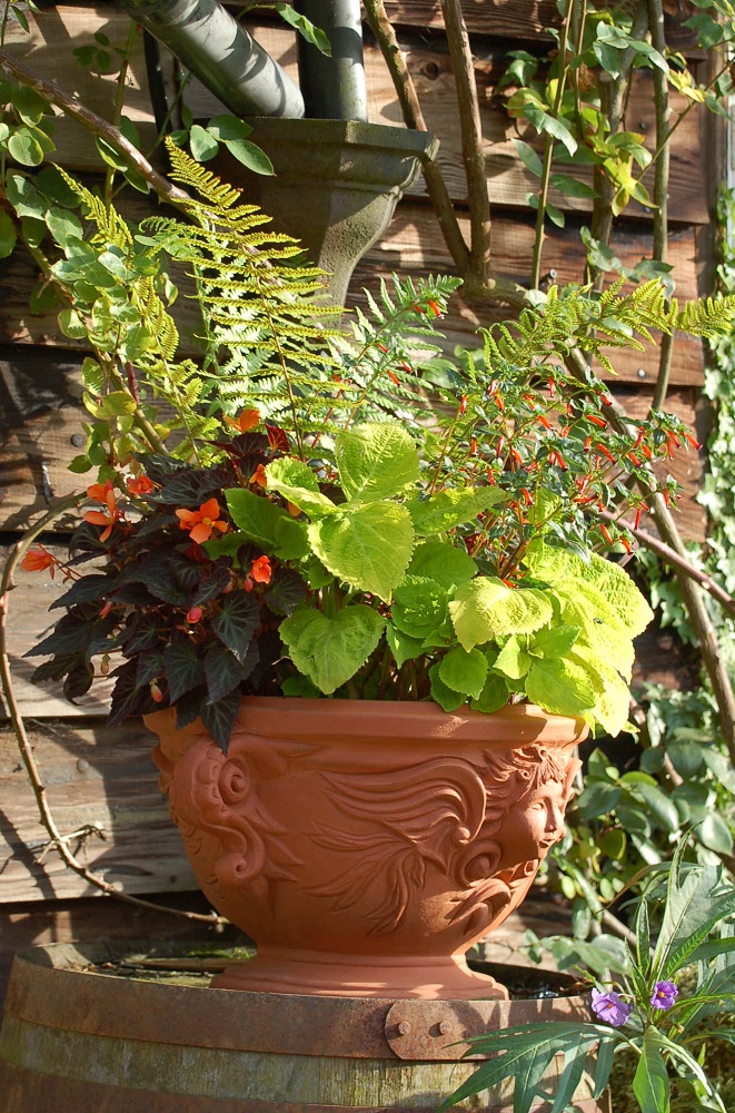 It is usually easy to get an interesting photograph of the Seraphim Pot, whatever the planting. This year I have a fern in it (please don't ask me which one, I'm very bad at ferns) plus seed-grown Cuphea ignea with its incandescent orange cigars, Begonia 'Glowing Embers' and Coleus (or Solenostemon) Giant Exhibition 'Limelight'. I am very smug about this planting, not just because it glows nicely against the dark wood of the pottery building but because of the fiery names. Silly really because most people will be oblivious to them but I must take these little moments of self-satisfaction when I can get them.
