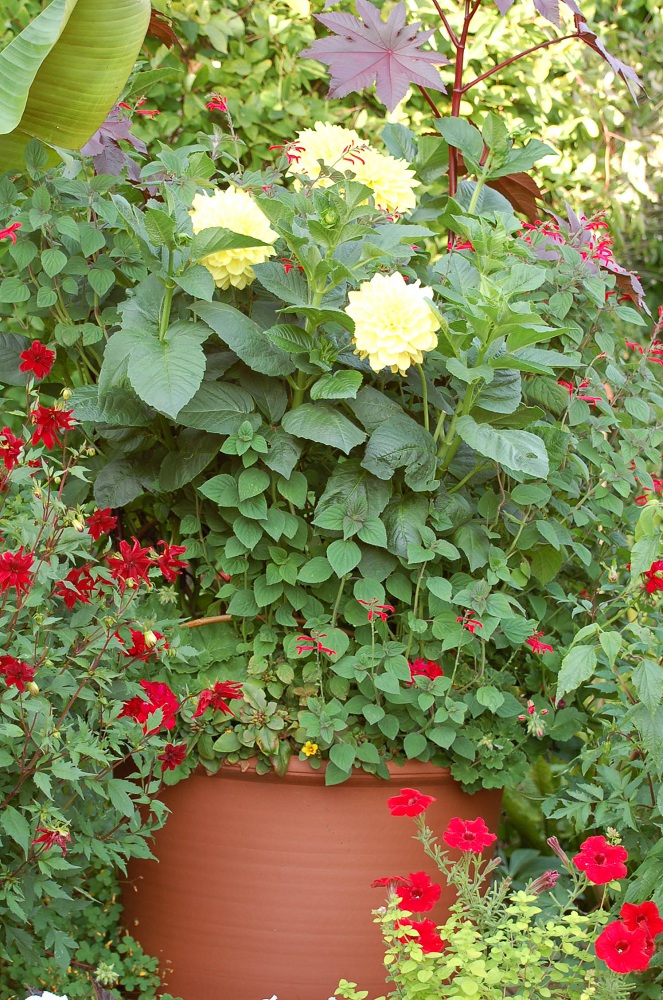 Giant Orange Pot overflowing with Brugmansia sanguinea, Abutilon megapotamicum, Pelargonium 'Paul Crampel'