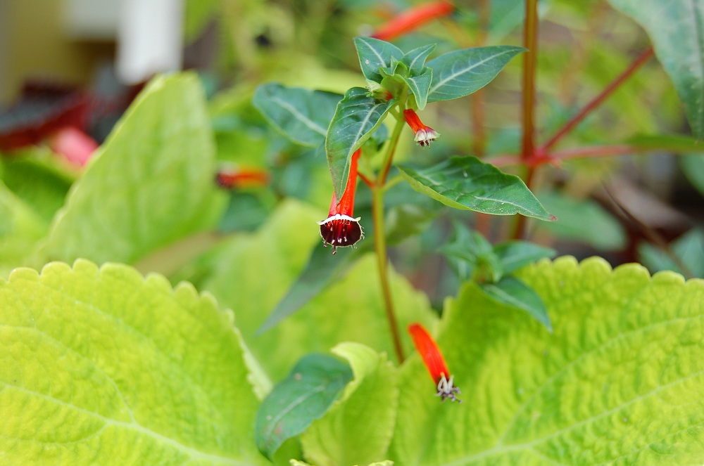 | Cuphea ignea and Solenostemon (or Coleus) Giant Exhibition 'Limelight' |