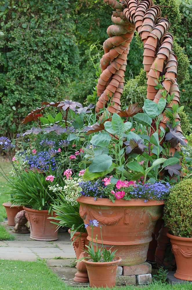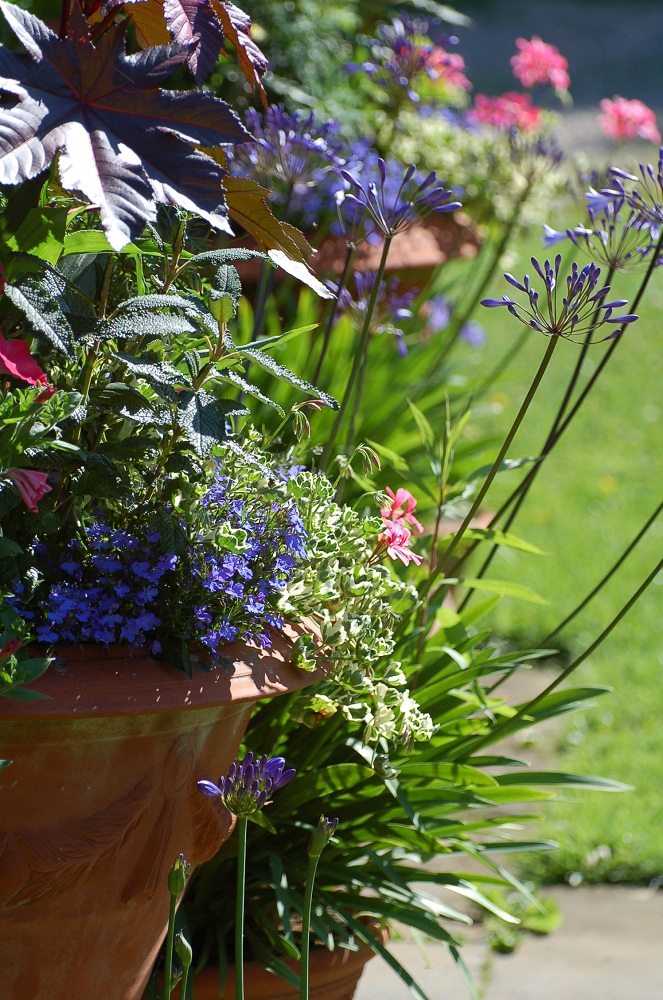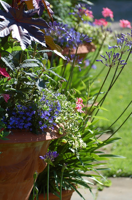 I have parked rich blue Agapanthus (happiest by themselves rather than in mixed plantings) in this group - there is only just room for them either side of the path but they look so gorgeous and enjoy the open position so much that even though they encroach on the walkway I am keen to keep them there while they flower. I'll replace them with pots of salvias, fuchsias and dahlias when they have finished.