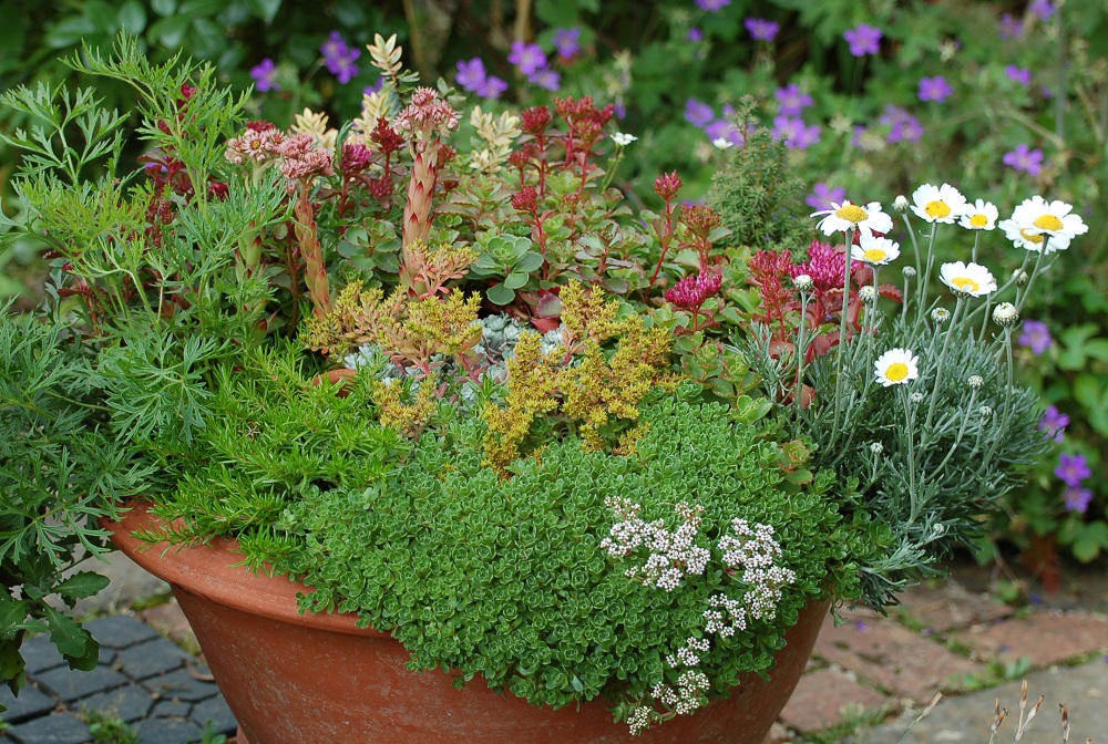 | A happy jumble of alpines in a Whichford Orange Pot |