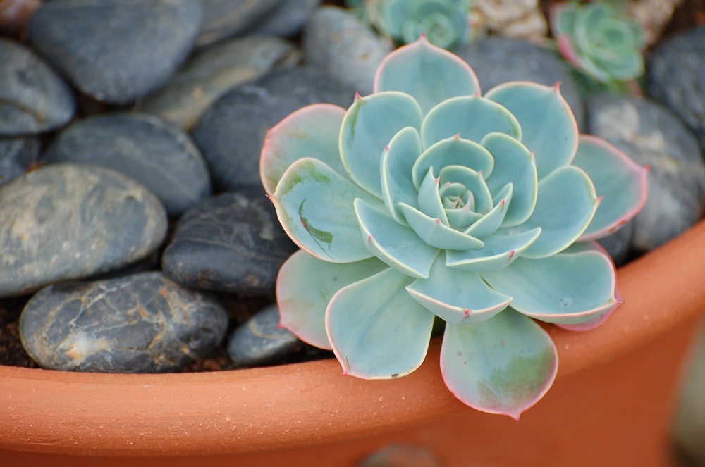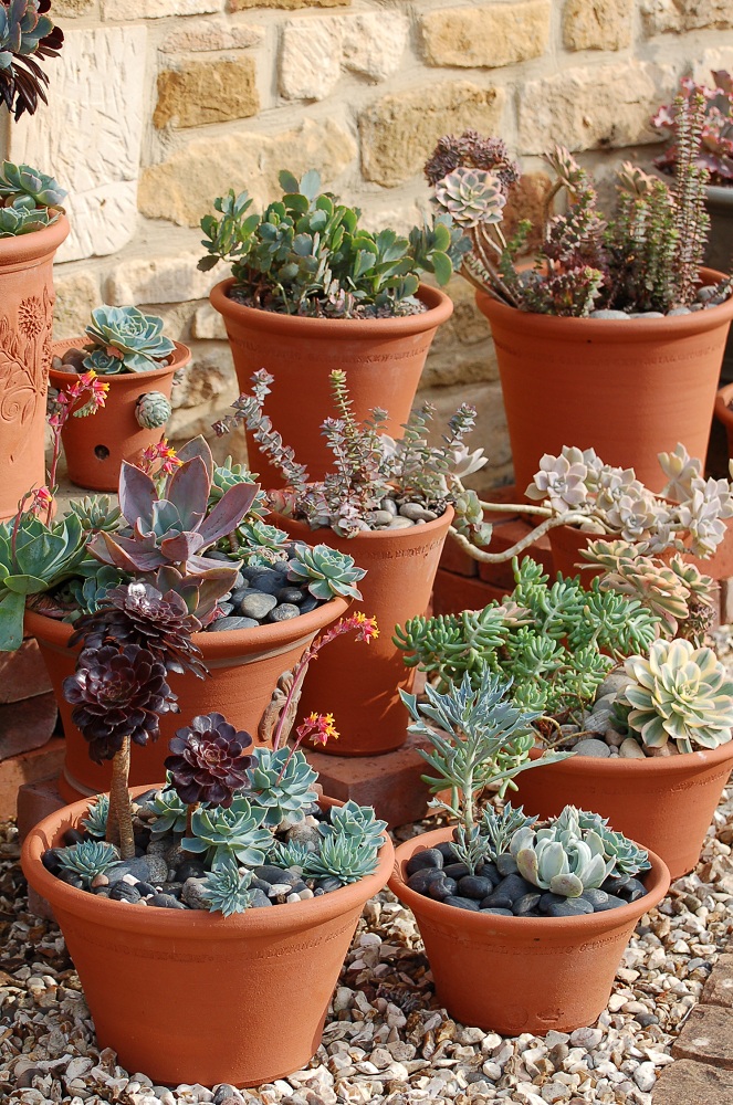 Many succulents have a distinctly rubbery look about them - this fat smoothness contrasts well with the roughness of terracotta, which is why succulents look so much better in real terracotta than in terracotta-coloured plastic.