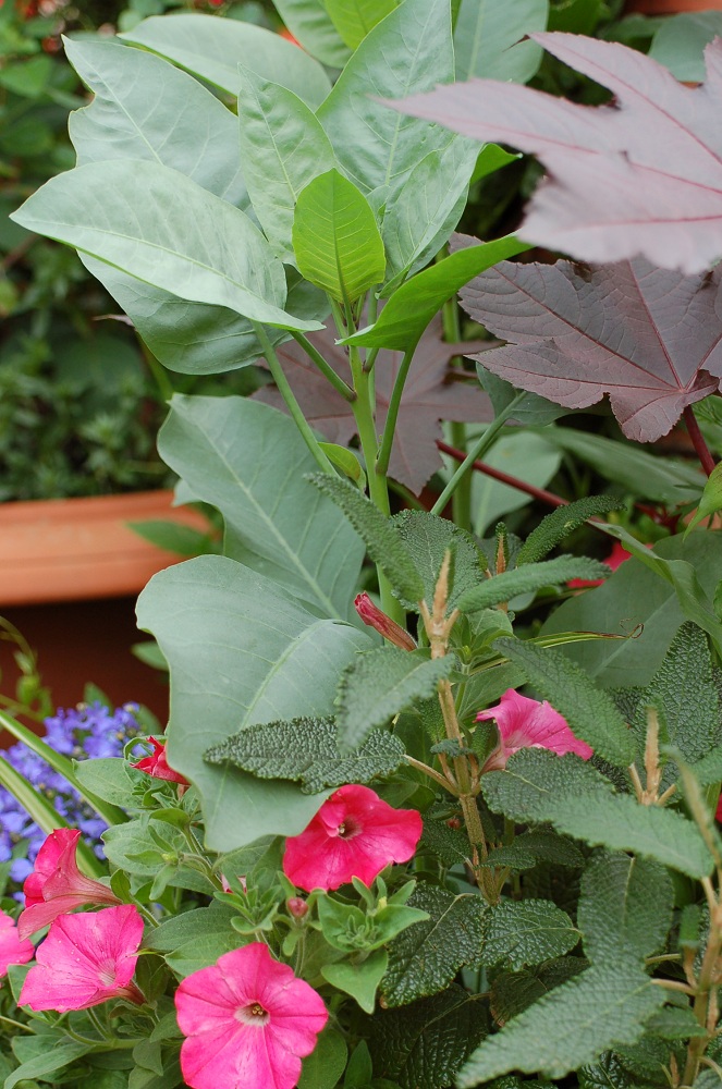In our changeable and changing climate I try not to rely purely on fleeting flower colour for visual satisfaction. Foliage colour is much more long-lasting and reliable. In the large italianate pots which flank the entrance arch maroon Ricinus 'New Zealand Purple' and blue-grey Nicotiana glauca are sprouting upwards and contrasting dramatically with each other.