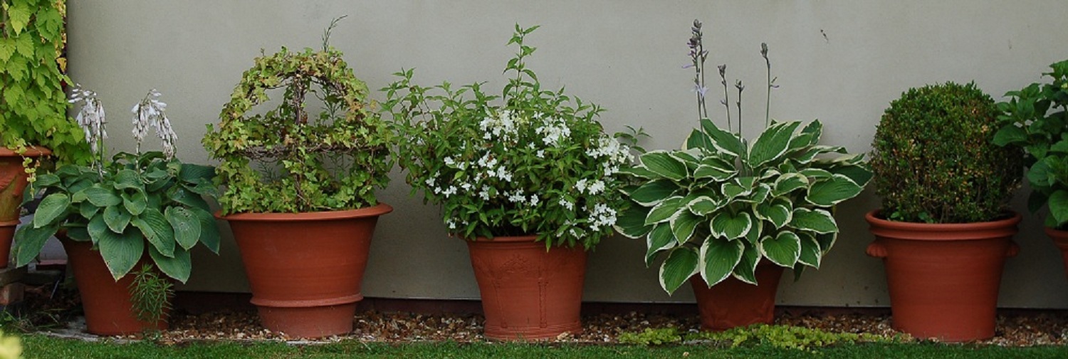 | Hostas, ivy, hydrangeas and box - shades of green in a selection of Whichford pots |
