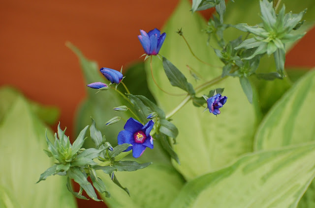| Anagallis monelli 'Skylover' begins to flower by the entrance to Whichford Pottery |