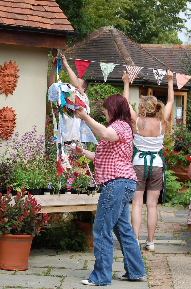 | Lynne's home-made bunting being put up |