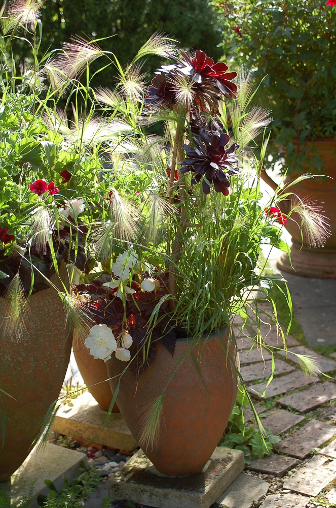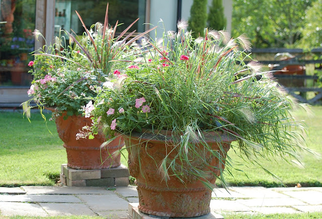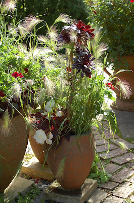 Hordeum jubatum is a case in point: this decorative barley really glows in slanting light, it comes to life in a breeze and is looking its best at the moment. In the second picture it is in two of our medium sized Swag and Acanthus pots and brushes softly against you as you pass. I love it when the plants in a garden reach out to touch you as you walk along a path.