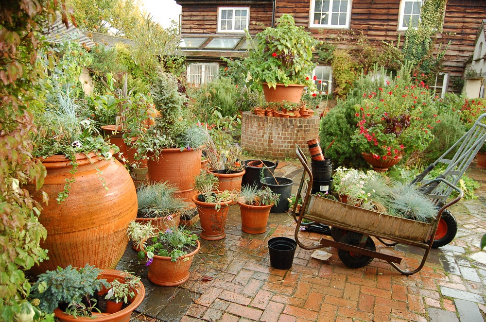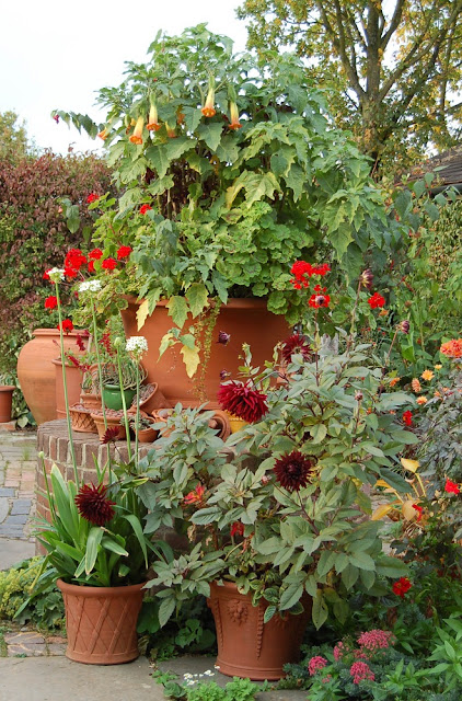 and Dahlia 'Black Jack' in Whichford Pottery's courtyard garden |