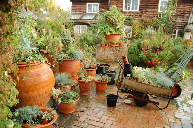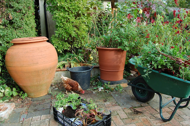 This week we dismantled the display inside the entrance to the courtyard garden, much to the delight of Jim and Dominique's hens. The hens have been very free range for a few weeks, their scratching about makes an awful mess and they have marmalised a clump of pinks, but I am tolerating it for the moment because they are doing a good job of gobbling up earwigs, woodlice and vine weevils, all of which have thrived in this dry summer.